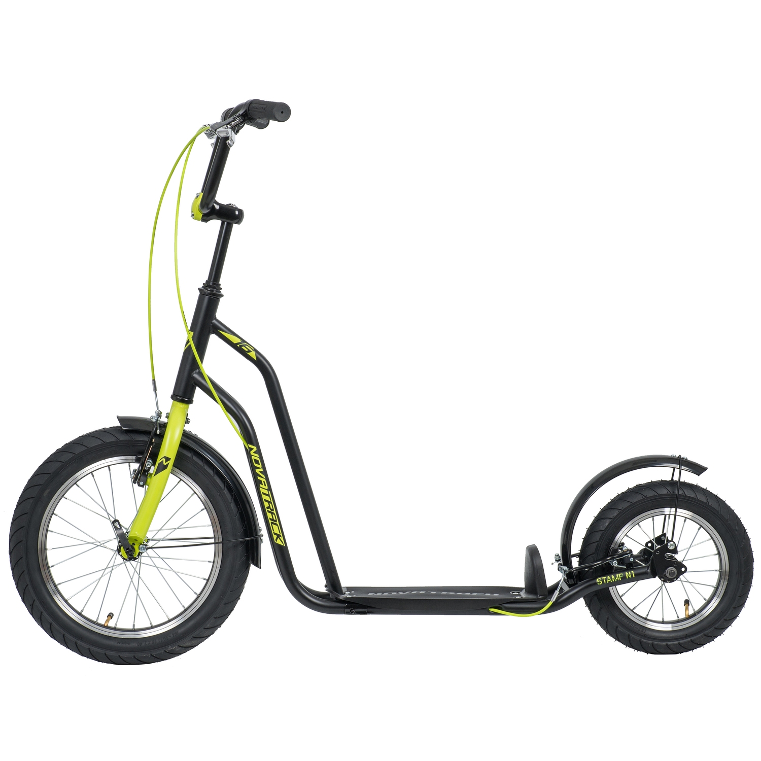Самокат Novatrack STAMP N1 порадует всех любителей активного образа жизни. Широкие надувные колеса диаметром 16 и 12 дюймов позволят кататься не только по асфальтовым дорожкам, но и с легкостью преодолевать парковые тропинки. Надежные передний и задний ручной тормоз обеспечивают безопасное торможение даже с очень крутой горки. Надувные колеса имеют ряд ощутимых преимуществ. Они бесшумны, с мягкими колёсами поездка будет мягче и комфортнее. Хорошо защищают от неровностей благодаря амортизирующим свойствам. Такие колёса комфортны при езде по неровным дорогам. В дождливую погоду надувные колеса увереннее держатся в поворотах. Они отлично тормозят и не скользят на разных поверхностях. Благодаря отличному сцеплению, помогают развивать более высокую скорость.