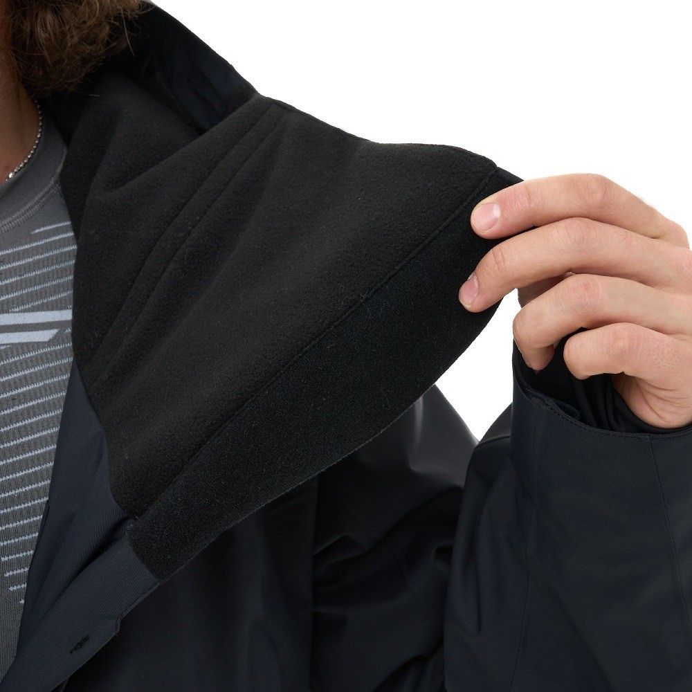 - Высокий ворот и объёмный капюшон с возможностью утяжки, который можно надеть на шлем.