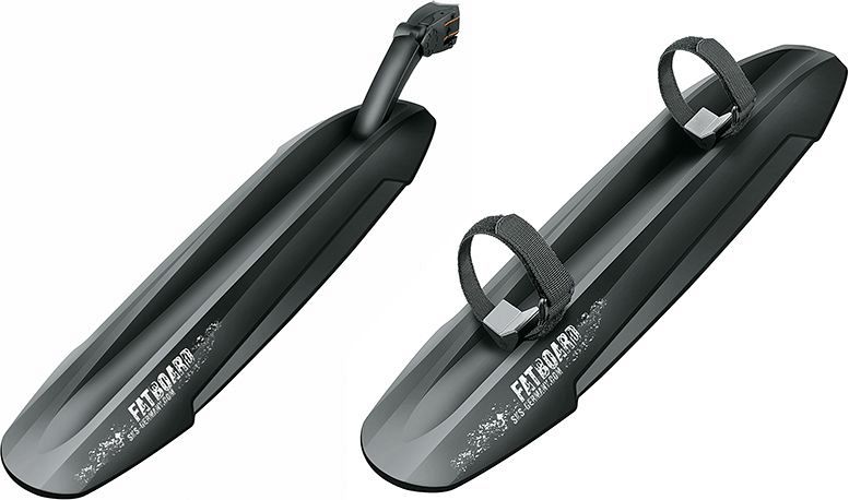 Комплект крыльев для фэтбайков SKS Fatboard, 26"-29", ширина колеса 3,0-4,8", длина переднего крыла 480мм, заднего - 480мм, вес 377 гр., крепление на нижнюю трубу рамы, на подседельный штырь. Изготовлен из высококачественного ударопрочного пластика, обеспечивает всестороннюю защиту от брызг. Удерживает грязь при ширине профиля до 141 мм. Передний щиток просто крепится к нижней трубе рамы с помощью высокопрочных резиновых стрэпов. Заднее крыло можно установить на подседельный штырь или подседельную трубу за считанные секунды с помощью быстросъемной эксцентриковой системы крепления. Две точки регулировки позволяют адаптировать крыло к геометрии вашего фэтбайка.