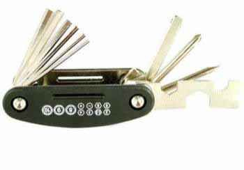 Компактный мультитул с набором шестигранников и накидных головок. Выполнен из стали с пластиковой рукояткой.