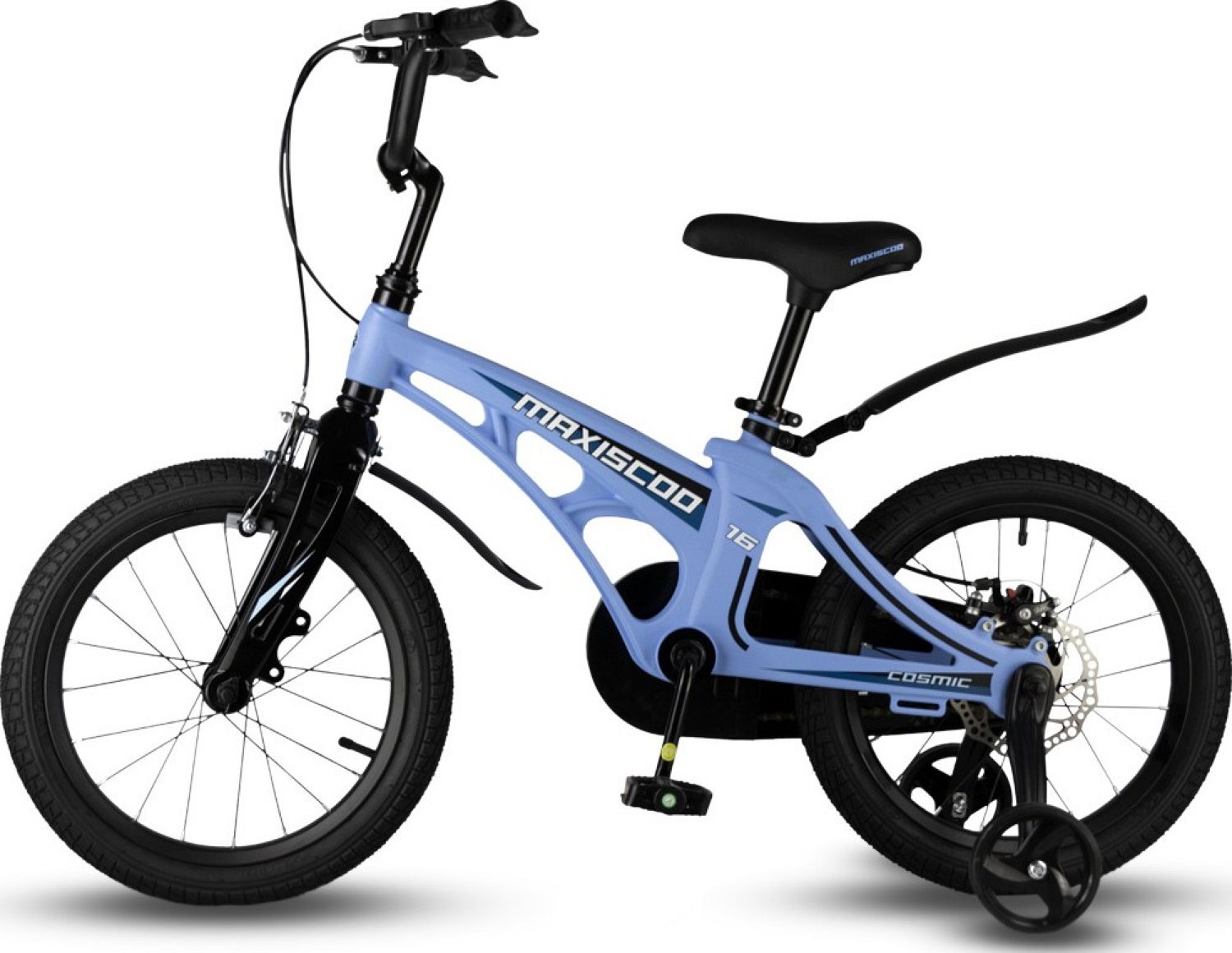 В комплекте с велосипедом идут боковые колеса, крылья и звонок, а также полная защита цепи. Это обеспечивает дополнительную безопасность и комфорт при езде, позволяя ребенку наслаждаться своими приключениями на велосипеде Maxiscoo COSMIC Стандарт 16" (2024).