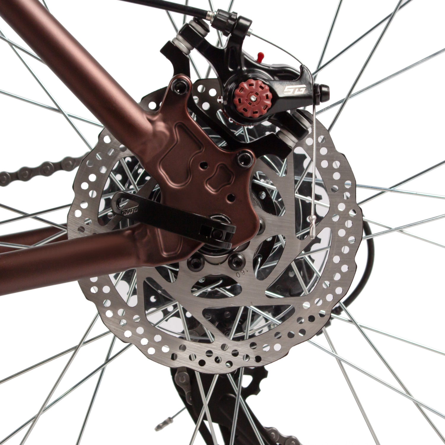 Дисковые механические тормоза STG с роторами 180/160 мм производят надёжную остановку, особенно на сложных участках. Дисковые втулки на быстросъёмных эксцентриках и покрышки ZX Sporter 2.0 демонстрируют отличное сцепление и долговечность, позволяя уверенно кататься по различным поверхностям.