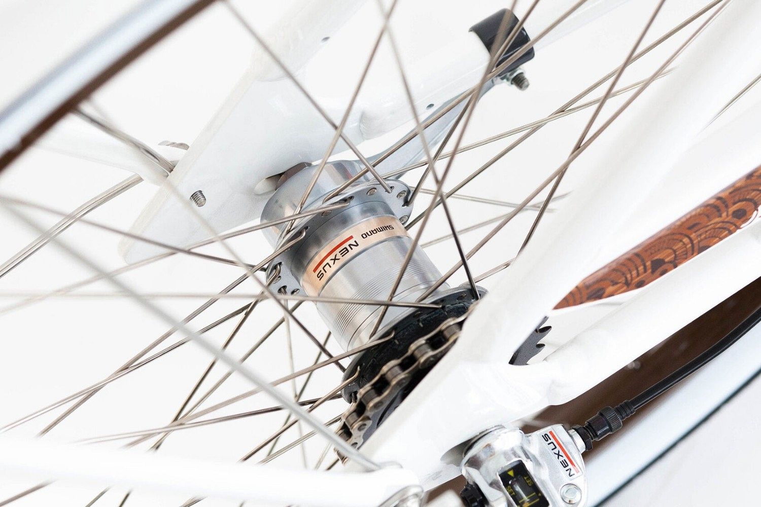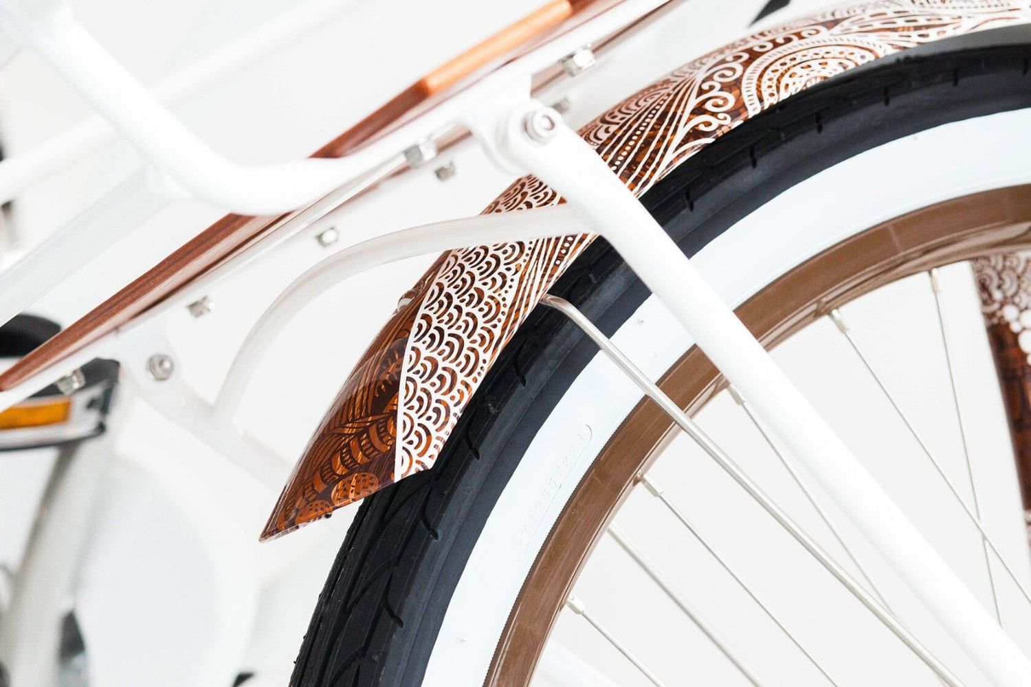 Особое внимание привлекают передний и задний багажники со вставками из натурального дерева коа, которые не только функциональны, но и добавляют уникальный штрих к общему дизайну. Узоры гавайских племенных татуировок украшают раму, крылья, седло и звонок, придавая велосипеду неповторимый характер и стиль.