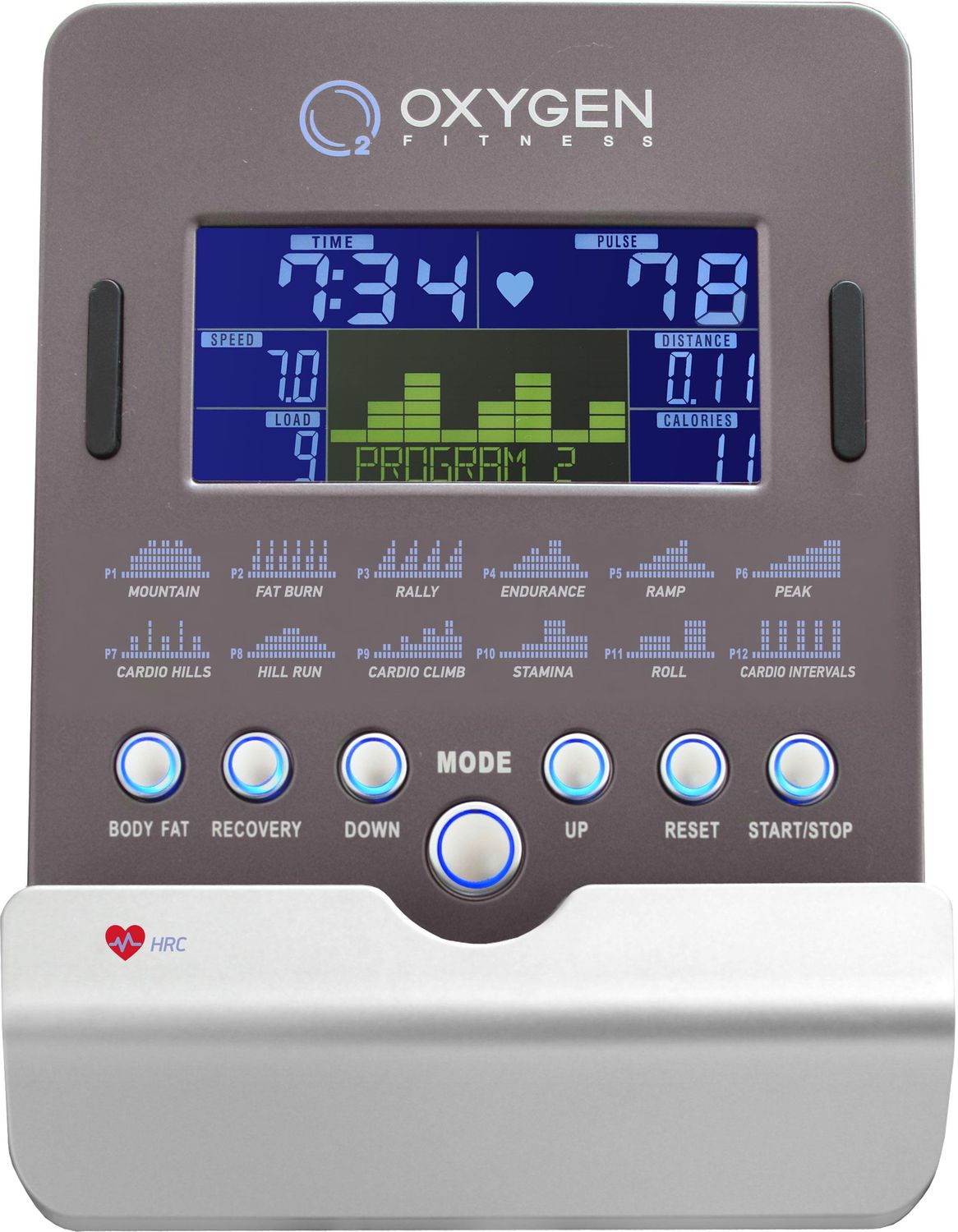 Тренировочный компьютер представлен цветным многофункциональным LCD дисплеем размером 5.5 дюйма (14 см.). В программный пакет входят 12 предустановленных программ, направленных на тренировку скоростных качеств, выносливости, укрепления сердечно-сосудистой системы и похудания. Помимо предустановленных программ, можно воспользоваться самостоятельно регулируемым ручным режимом, а также создать собственную программу. Важной особенностью тренировочного компьютера является наличие 4-ех пульсозависимых программ с предустановленными значениями 55%, 75%, 90% и 100% от целевого максимального пульса. Для точного определения пульса и просто комфортной тренировки в компьютер встроен беспроводной приемник. Эргонометрическая функция (Ватты) позволяет зафиксировать необходимый уровень нагрузки – он останется постоянным вне зависимости от скорости вращения педалей. По завершении тренировки функция Recovery оценит способность сердечно-сосудистой системы к восстановлению. Жироанализатор (Body Fat) предоставит дополнительную информацию o состоянии организма.