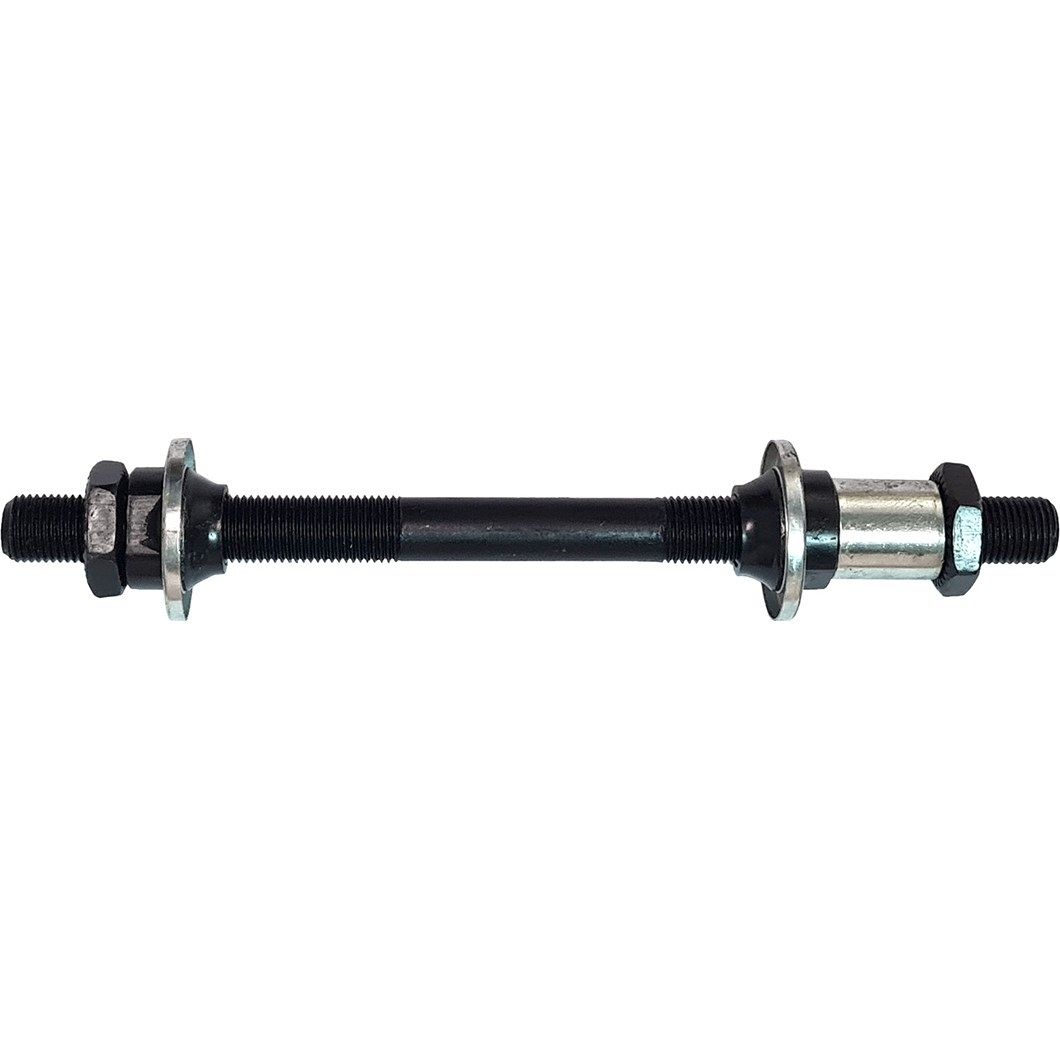 Ось задней втулки предназначена для надёжного крепления заднего колеса к раме велосипеда. Имеет диаметр 3/8 дюйма и длину 145 мм. Полая конструкция из высококачественной стали отличается лёгкостью и прочностью. В комплект входят конусы и контр гайки для точной регулировки натяжения подшипников. Чёрное покрытие защищает от коррозии и придаёт стильный вид. Подходит для большинства велосипедов с эксцентриковым креплением, гарантируя стабильность и долговечность в эксплуатации.