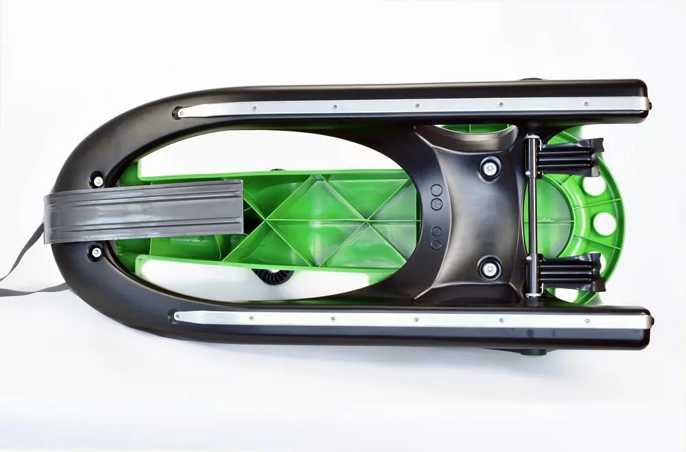 Снизу расположены металлические полозья, которые улучшают скольжение и защищают снегокат от повреждений.