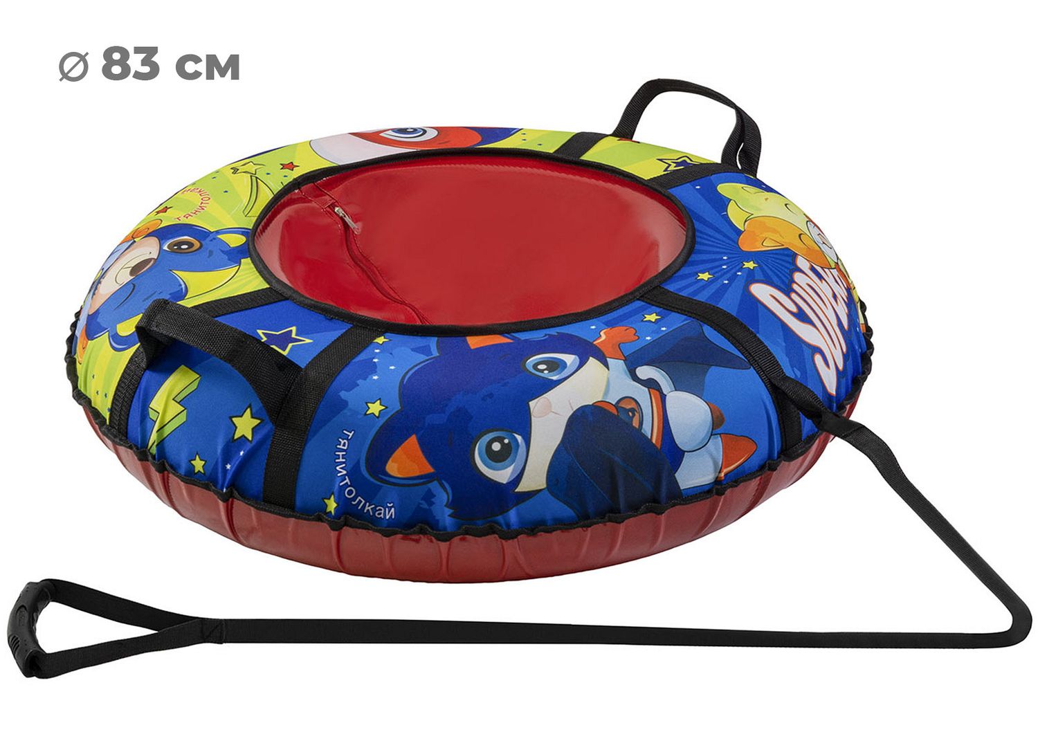 Размер тюбинга составляет 83 см, этот размер позволяет кататься на нём детям ростом до 110 см. Данный тюбинг выдерживает вес до 50 кг