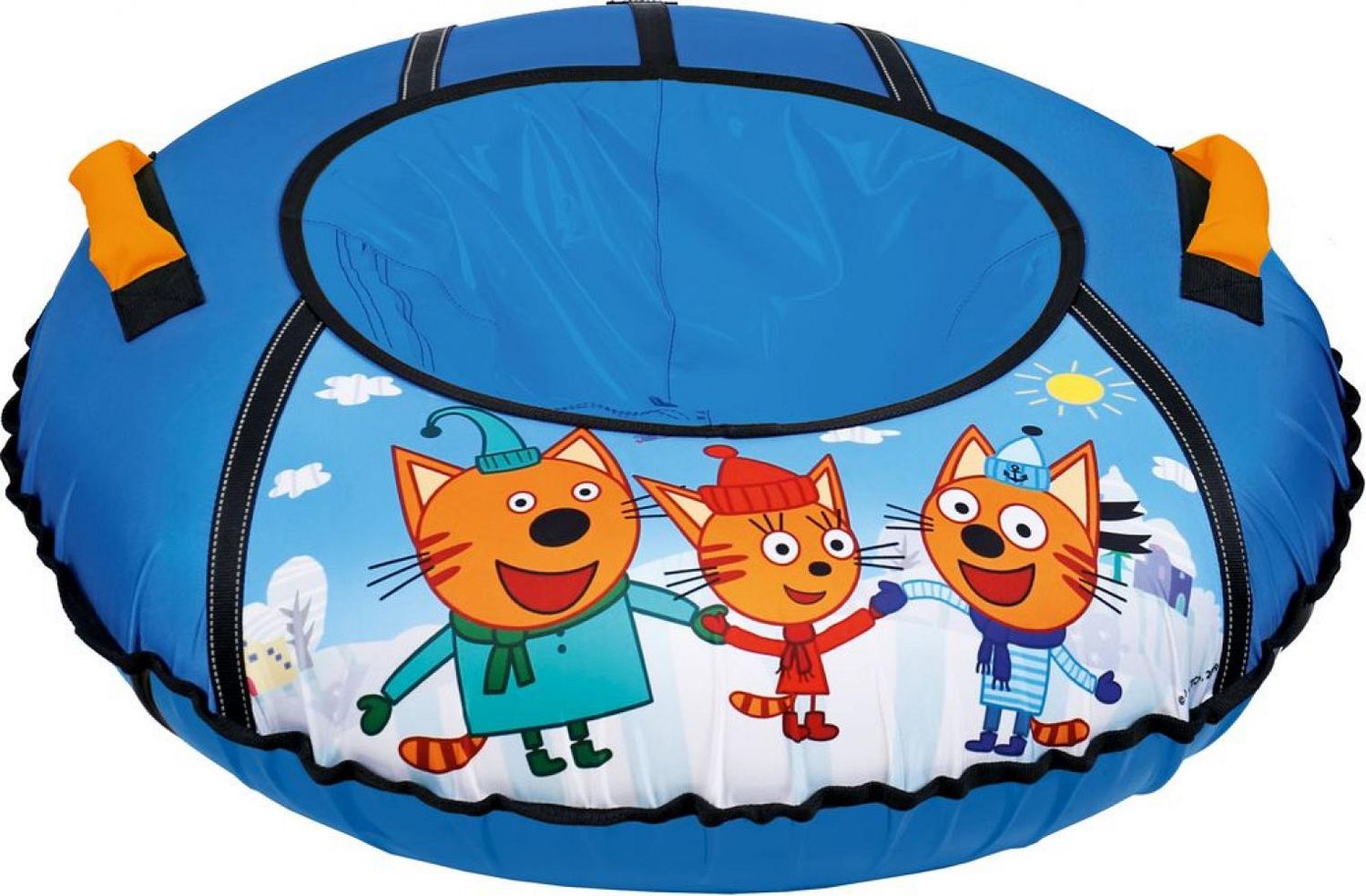 Тюбинг с рисунком «Три кота» изготовлен из прочного тента, который устойчив к морозам до 28 градусов, все швы усилены капроновой лентой.